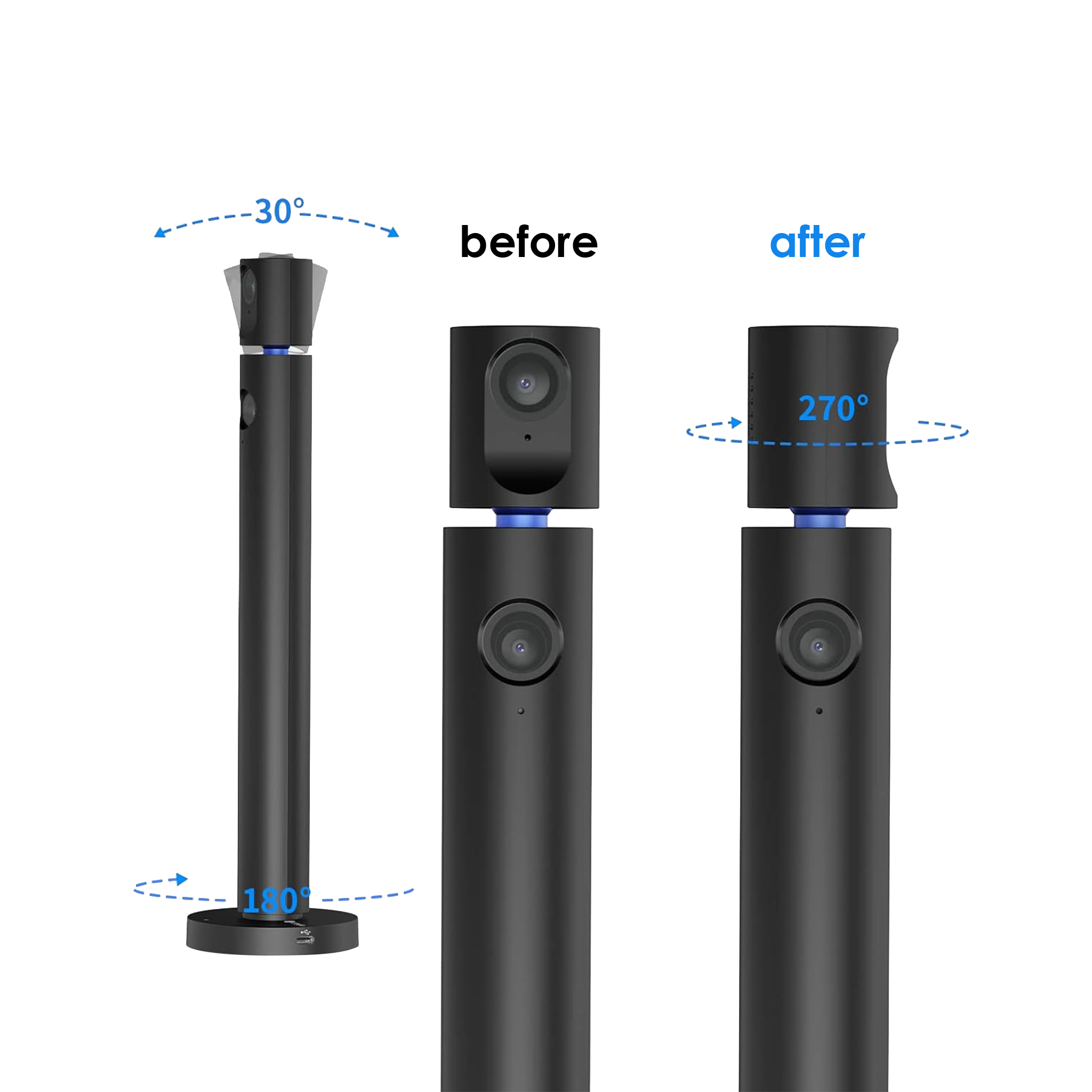 Flexible Rotation: 90° wide-angle lens; base rotates 180°, top 270°.